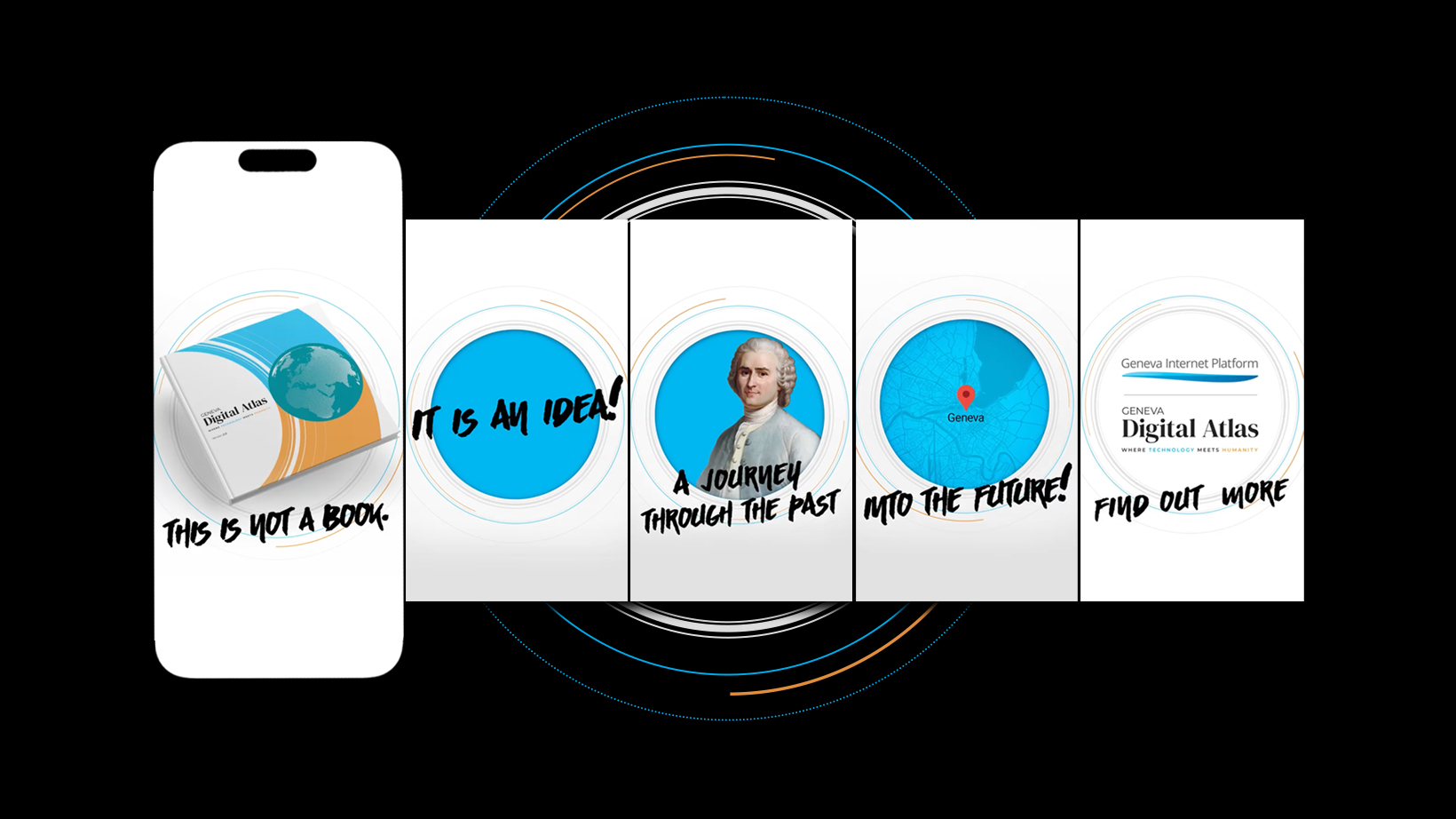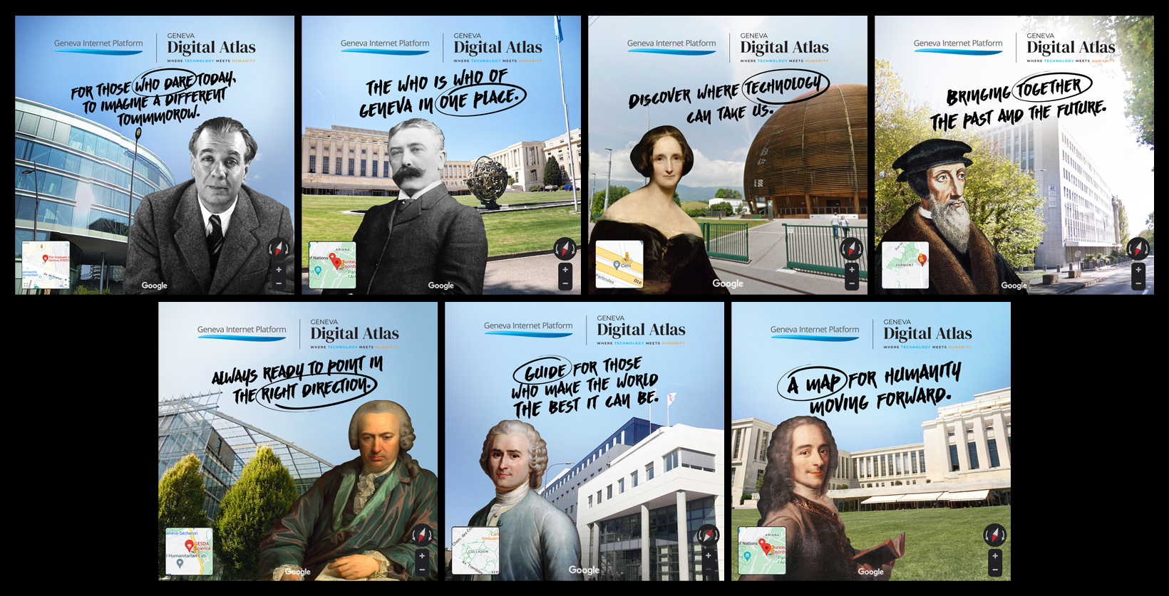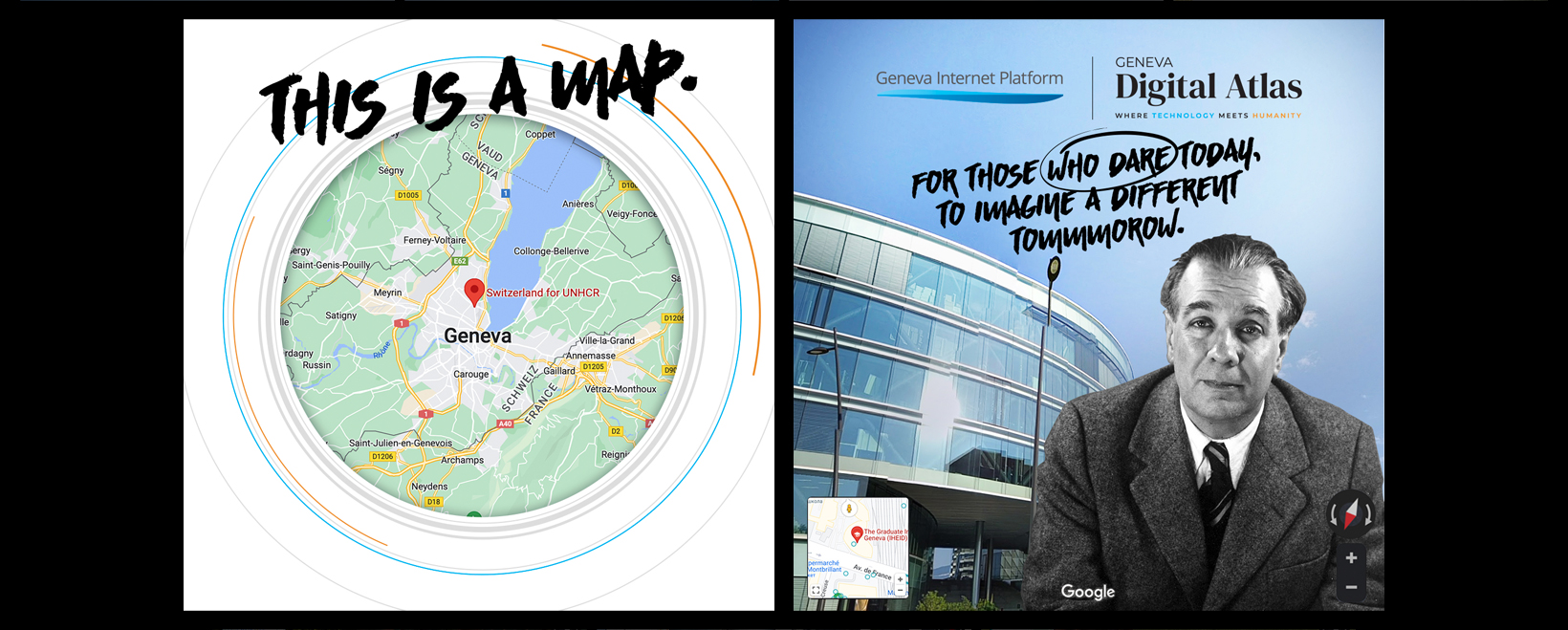 This series of uniquely crafted visuals uses Google Maps to promote Geneva Digital Atlas platform.