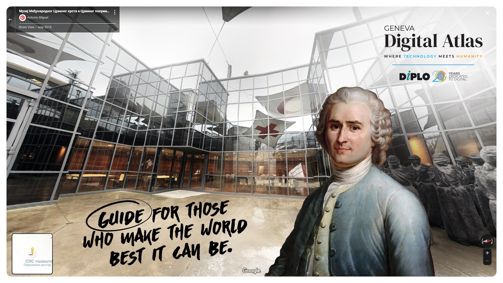 We applied Google Street View to take people on a journey through Geneva, bringing together historical figures and real time relevant institution that create the current digital world policy.